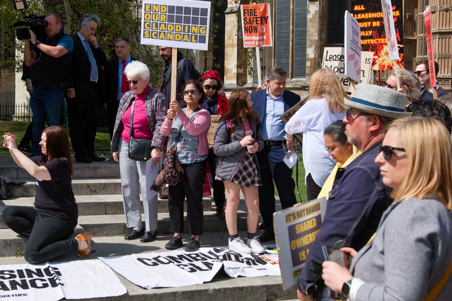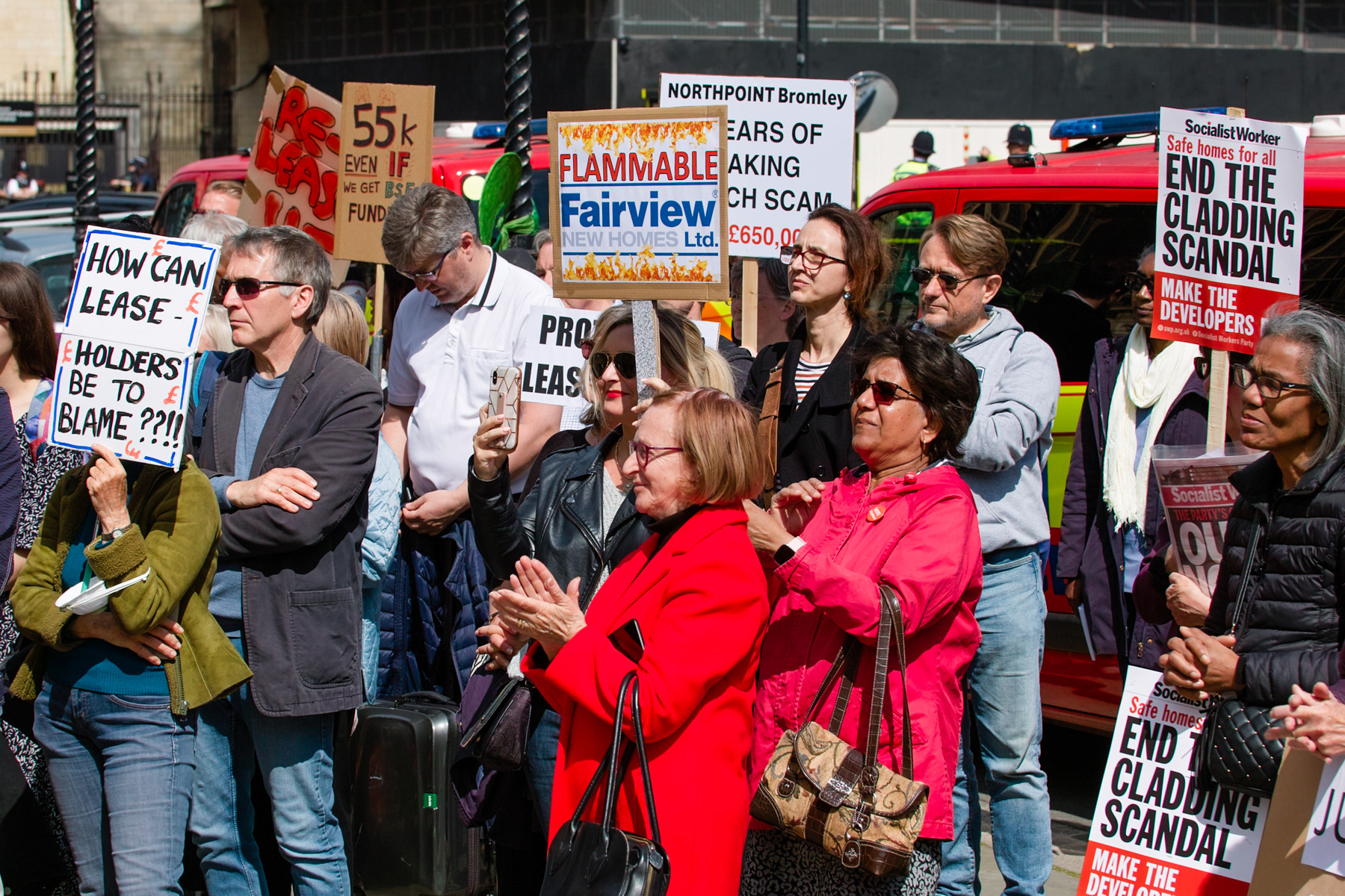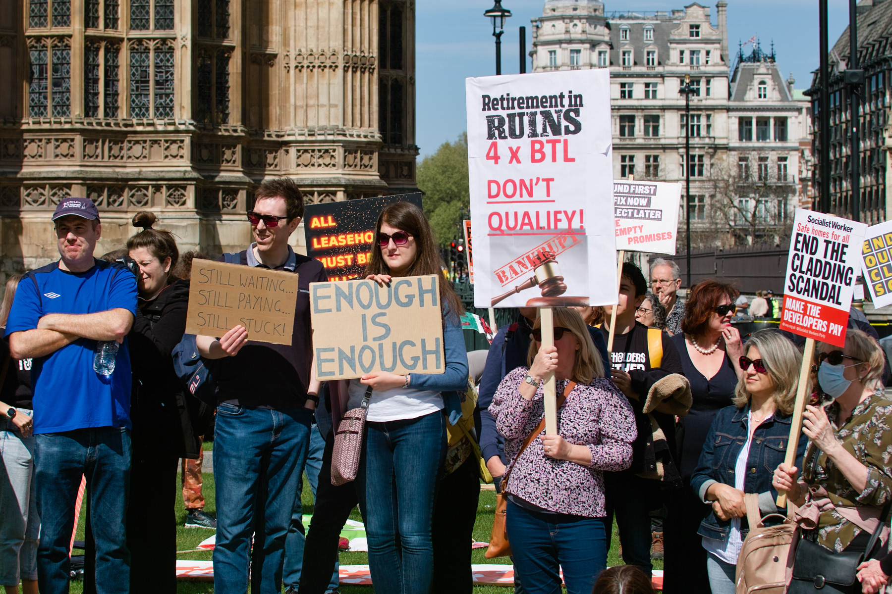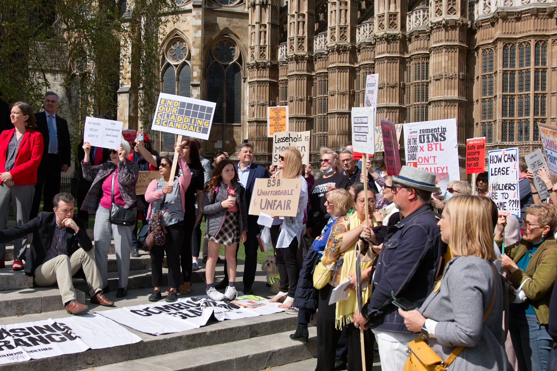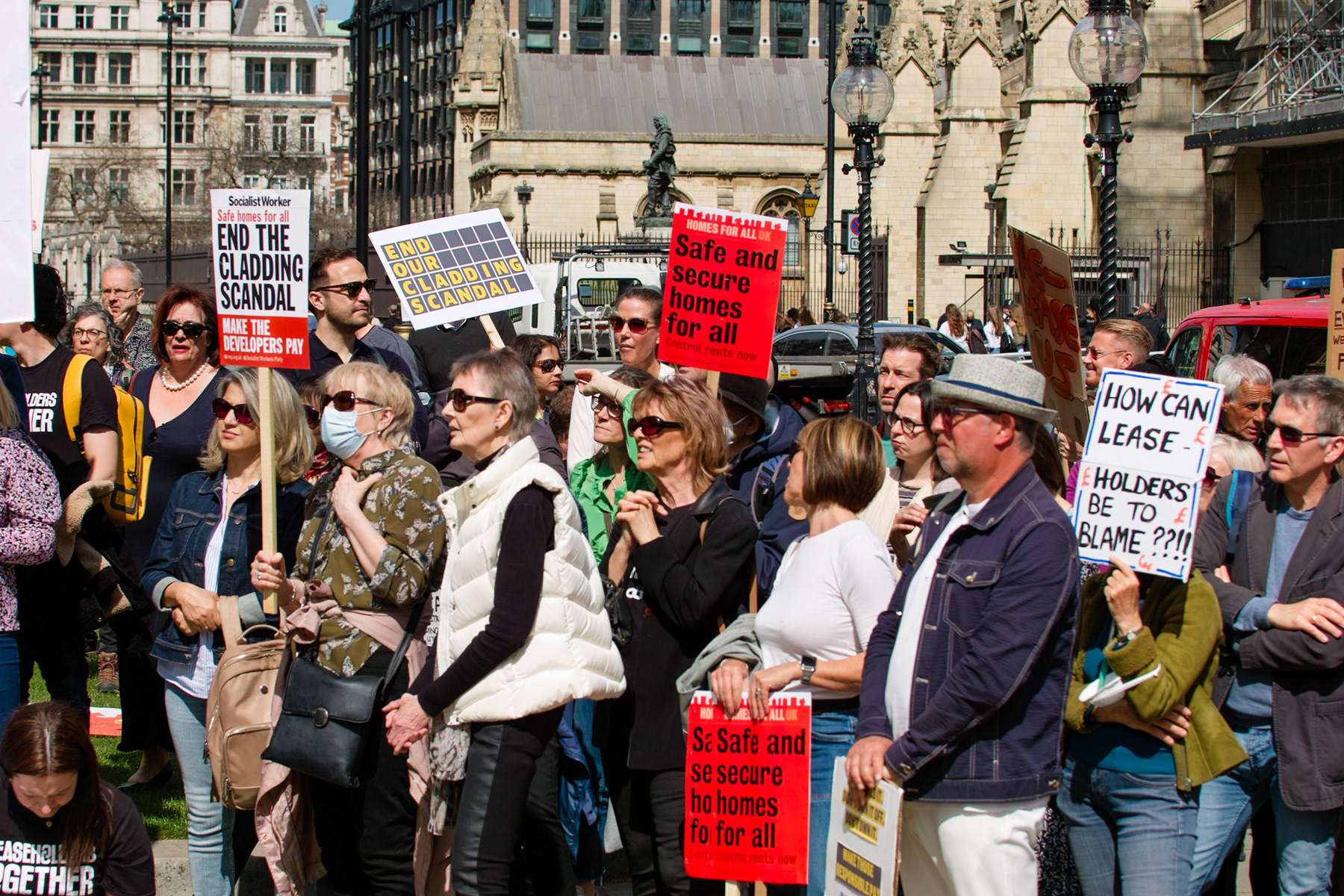 This protest rally on College Green, Westminster was organised by End Our Cladding Scandal campaign. It was the final chance for leaseholders to make their voices heard in advance of the Building Safety Act 2022 which was in debate before the new parliamentary session. Despite the protections announced by the Bill, which became law on the 1st April 2023, many leaseholders continue to remain trapped by the building safety scandal.